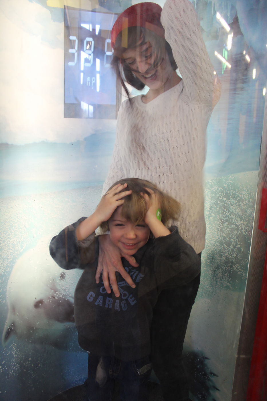 Jacqueline and Liam in “Artic Blast” wind chamber at 80 mph at Edventure:
