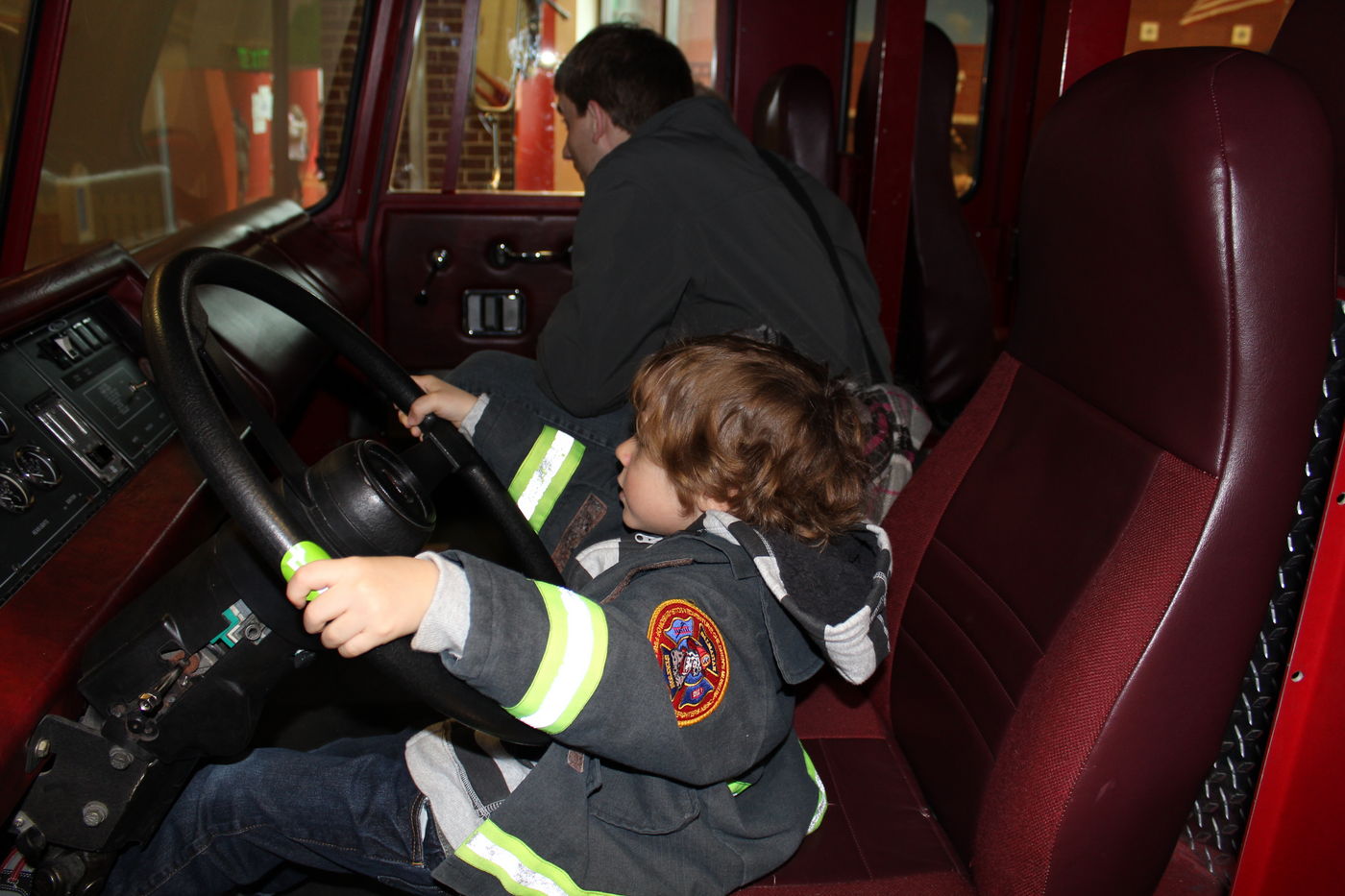 Liam at Edventure in Columbia sitting in a firetruck: