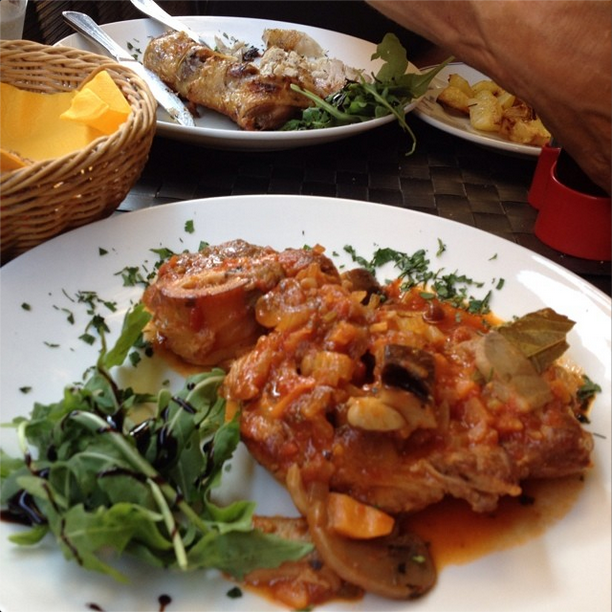 July 6: Ossobuco for dinner tonight at street side cafe. Very good!